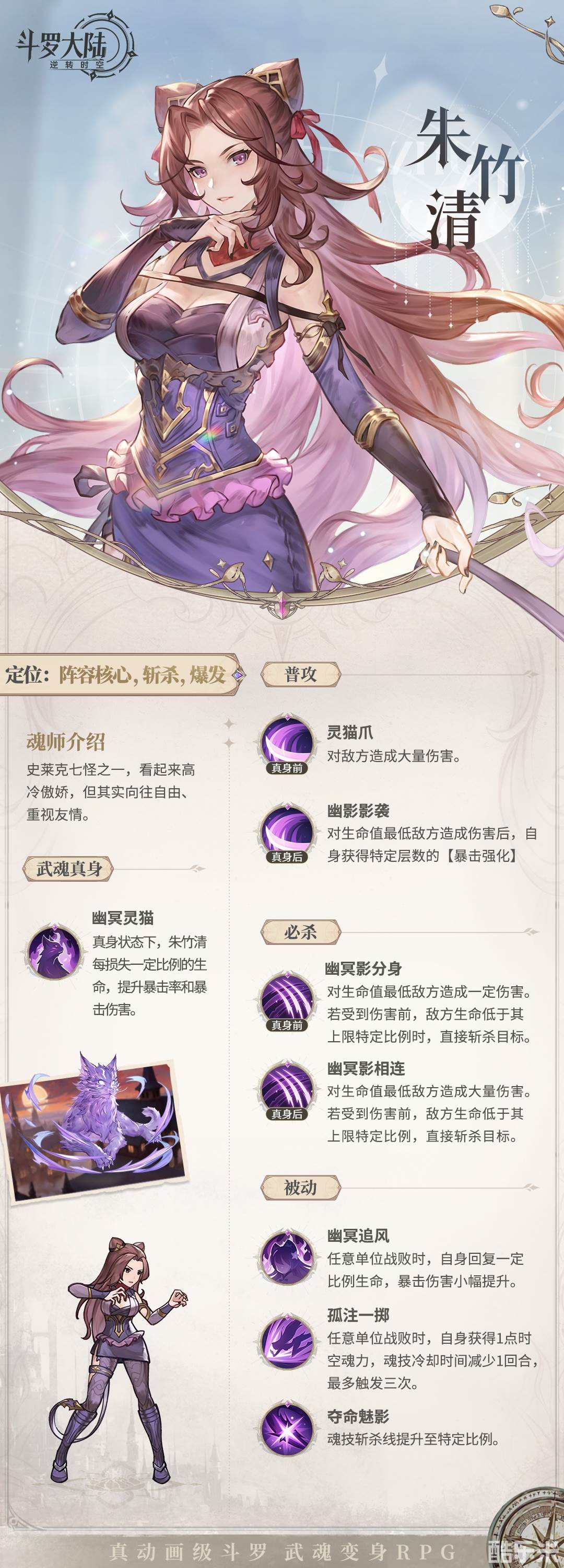 朱竹清出生于星罗帝国贵族的朱家 不想和戴沐白定亲,挣脱了家族的束缚,游戏中可以作为一个阵容的核心,爆发能力非常的高,并且在开启武魂真身后,只要受到伤害就可以提高暴击的效果。首先是他的普攻灵爪猫,操作后可以对敌人产生一定效果的伤害,而且他的必杀技幽冥影分身,直接攻击对方生命值最低的敌人,遇到生命值低于一定比例的敌人,可以直接进行斩杀。