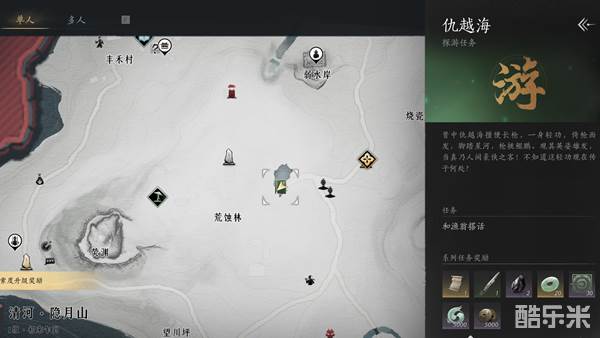 1、进入游戏后,先前往荒蚀林东北方这里,找到NPC仇越海对话,具体位置如图所示。