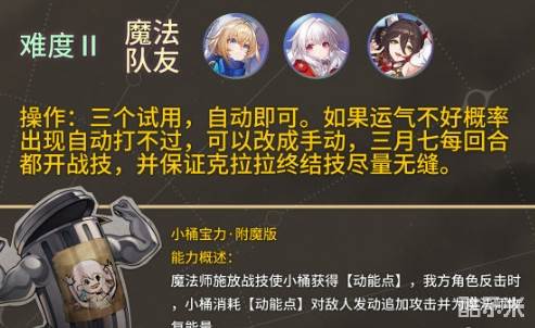 《崩坏:星穹铁道》开拓友谊魔法第2关一轮三动的桶这关的挑战难度比较低,玩家只需要注意怪物的攻击顺序和角色状态就可以了,有很多小伙伴对此还不太清楚,接下来酷乐米小编为大家介绍一下吧。