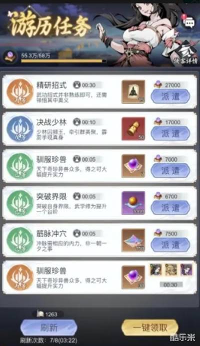 游历需要有阅历值,通过挂机可以获得很多阅历值,用阅历刷新游历任务,派遣侠客完成任务即可领取阅历奖励(奖励有各养成系统的消耗材料)