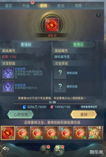 3、紫色以上的法宝可通过重铸重新生成技能和属性,属性类型不改变。每次消耗一定的灵石和法宝精华。