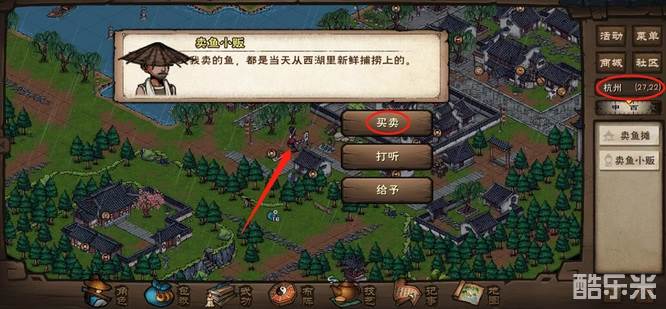 5、也可以来到杭州卖鱼摊(27,22)位置,找到卖鱼小贩,在对话中选择买卖,花费200文买一条鱼,每天可买5条。
