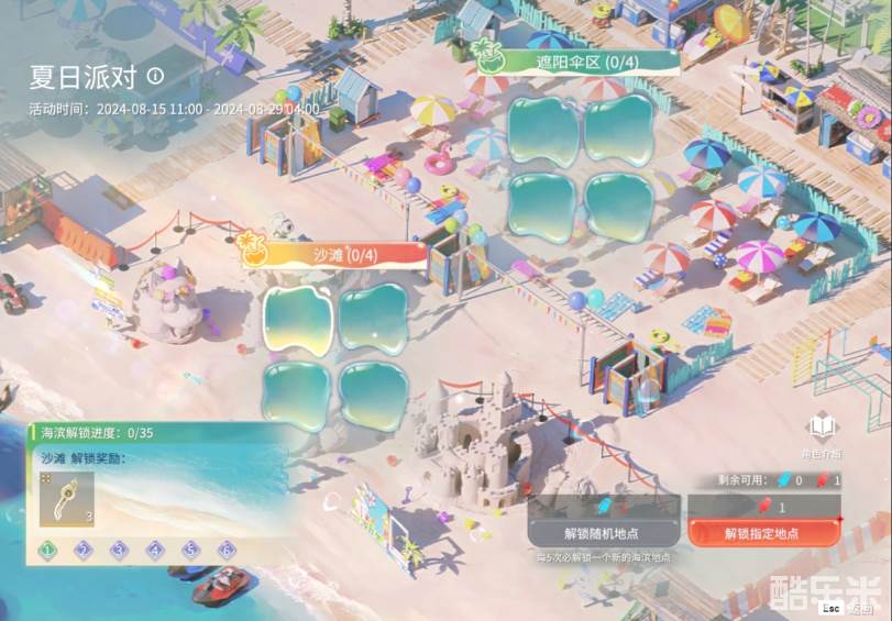 2、在活动界面中,消耗小雪糕可随机解锁一个海滨地点,解锁完一个区域的所有地点,可获得区域对应的奖励,并解锁一张夏日派对漫画,活动总计有6个区域等待解锁。