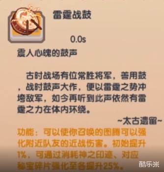 2、功能:使玩家召唤的图腾强化附近队友的近战伤害,初始提高1%,强化满级为25%。