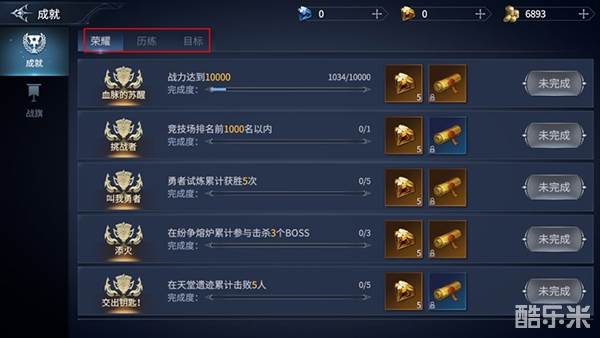 5、游戏内还有荣耀、历练、目标三大成就可以达成,领取黄钻、卷轴等奖励。