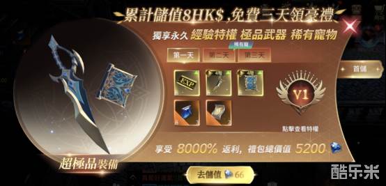 【首储】档位提供20%永久经验BUFF卡与4阶暗金传说武器,【再储】档位提供绿色套装项链,【崛起】档位提供两个绿色套装戒指