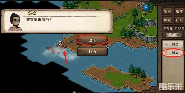 2、达到南阳渡后往南边走,来到渡口找船夫(白天在,晚上不在),和其对话选择“渡江”。