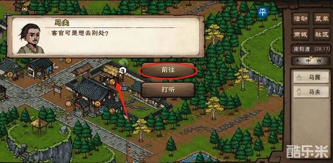 1、也可以来到当前所在地图,找到客栈旁边的马车,和车夫对话点击“前往”。