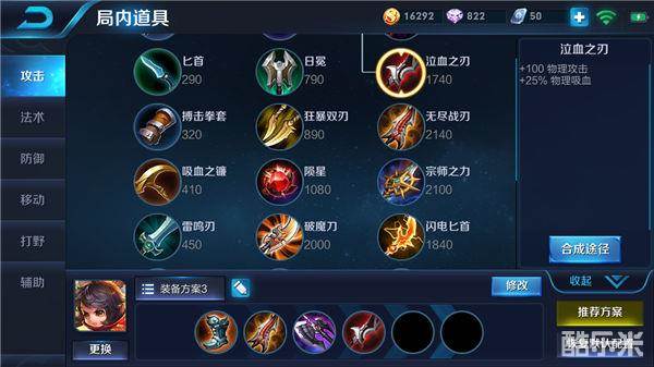 暗影战斧可以为李元芳增加一定量的物理攻击,将李元芳的技能伤害以及平A伤害提升,同时增加的物理穿透效果可以让李元芳攻击防御较高的敌人时,打出超高的伤害,并且普通攻击也有一定的几率让敌人减速,在敌人身上存在李元芳的一技能时,更加方便李元芳的追击以及击杀,泣血之刃可以为李元芳增加一定量的物理攻击,中期能够再次提升李元芳的伤害,同时被动效果还可以增加李元芳的物理吸血,让李元芳可以极为快速的击杀敌人,并且李元芳自身处于残血状态时,可以利用自己的二技能迅速脱离敌人的追击并通过攻击野怪或小兵来快速回复自身已损的生命值。