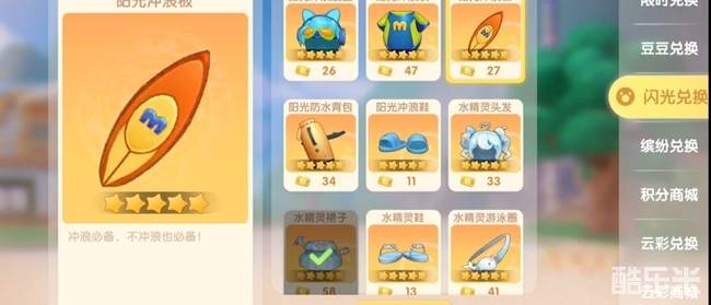 5、也可以在扭蛋机页面,在左侧点击闪光兑换栏目进入,兑换四星阳光冲浪板即可。