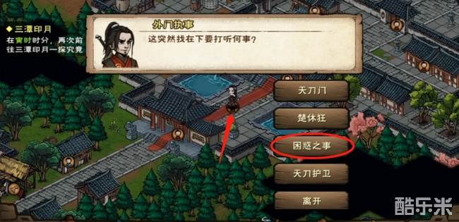 1、活脉法是天刀门的专属秘技,所以玩家要加入天刀且等级到达40级,然后来到(20,19)外门执事对话,选择“困惑之事”触发任务。