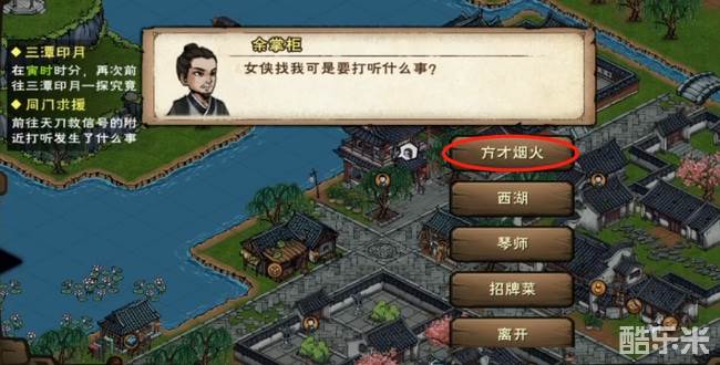 2、接着去杭州在岳王庙旁边的桥上闲逛,即可触发烟花求救信号,然后去楼外楼向余掌柜对话,选择【方才烟火】,再去紫阳书院找阮小七打听,得知同门已经死亡。