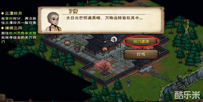 3、前往灵隐寺找到了情对话,选择“同门遗体”,随后遇到南宫仙羽触发一系列对话,对话完再回去找阮小七打听。