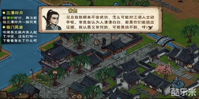 4、来到岳王庙的对面(26,10)找杨薄打听有关常危的消息,对话结束去岳王庙,在听常危自辩后,依次去客栈、正通钱庄、鱼贩这三个地方,打听消息后回去质问常危。