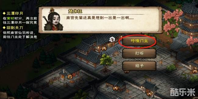 6、战斗结束并取胜后,回天刀门(23,14)和南宫仙羽对话,选择“发生何事”,再去顶天殿(14,11)找楚休狂对话,选择“呼唤门主”。