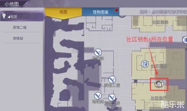 3、玩家在社区餐厅就能找到社区钥匙1,具体位置如上图所示。