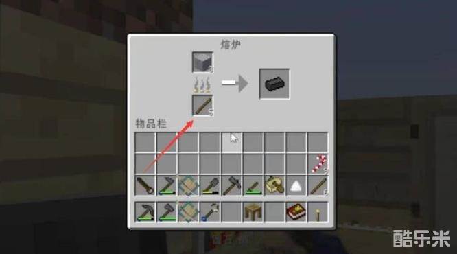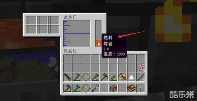 2、然后将铁块放入冶炼炉里,为提升温度可放入更多的燃料。