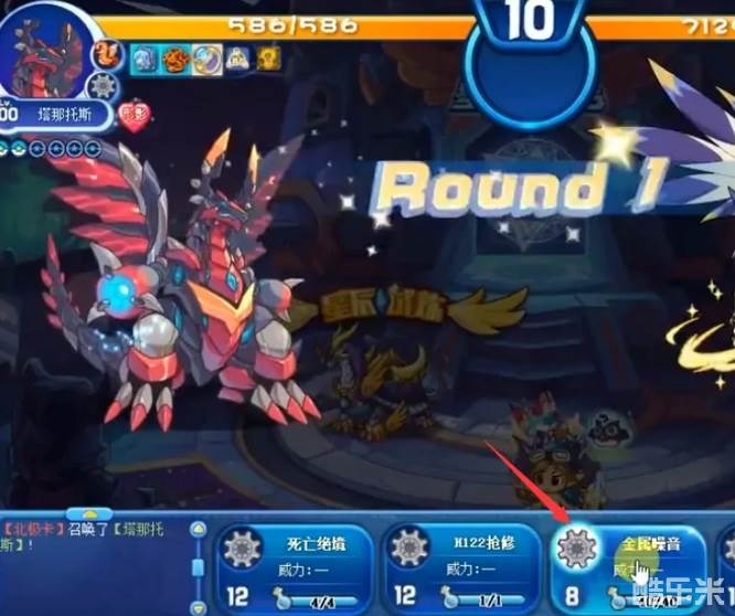 2、进入挑战页面,先选择“塔纳托斯”上场,点击下方的“金属噪音”降低boss的魔抗。