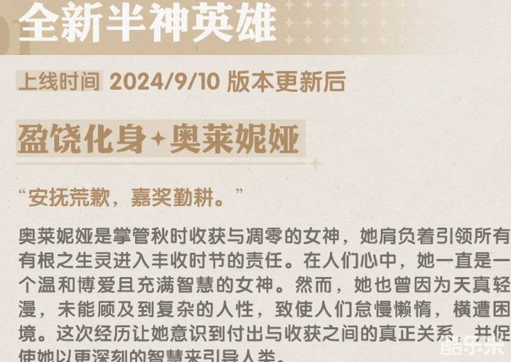 奥莱妮娅是掌管秋时收获与凋零的女神,她肩负着引领所有有根之生灵进入丰收时节的责任。在人们心中,她一直是一个温和博爱且充满智慧的女神。然而,她也曾因为天真轻漫,未能顾及到复杂的人性,致使人们怠慢懒惰,横遭困境。这次经历让她意识到付出与收获之间的真正关系,并促使她以更深刻的智慧来引导人类。