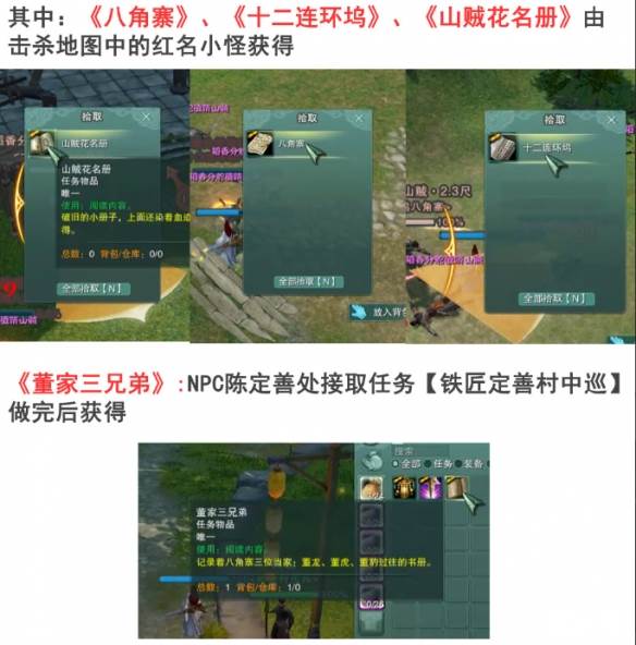 1、八角寨、十二连环坞、山贼花名册由红名小怪掉落。