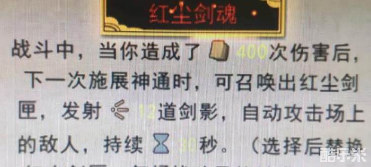 战斗中,当你造成了400次伤害后,下一次施展神通时,可召唤出红尘剑匣,发射后12道剑影,自动攻击场上的敌人,持续又30秒。(选择后替换红尘剑匣,每场战斗只能触发一次)