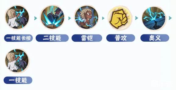 通过长按一技能拿到先手,随后释放二技能进行追击,随后开启雷铠并用普攻持续打伤害,在合适的时机释放奥义打出爆炸伤害,并接一技能继续连段。