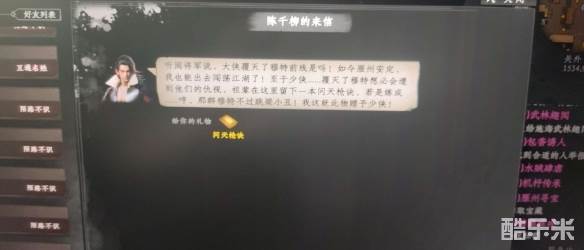 5. 玉沙关(1401,857)与郭青不谋而合后,然后返回(1534,970)告诉阎念双,然后继续对话选择站前准备。(当年千年天才陈家幼子陈不周来到雁州,一人守护一座城数十年,万人围城时血战中创下问天枪决,而他的后代却遭到穆特族报复,如今只剩下陈千柳一人,一心报仇,希望我去见见他)