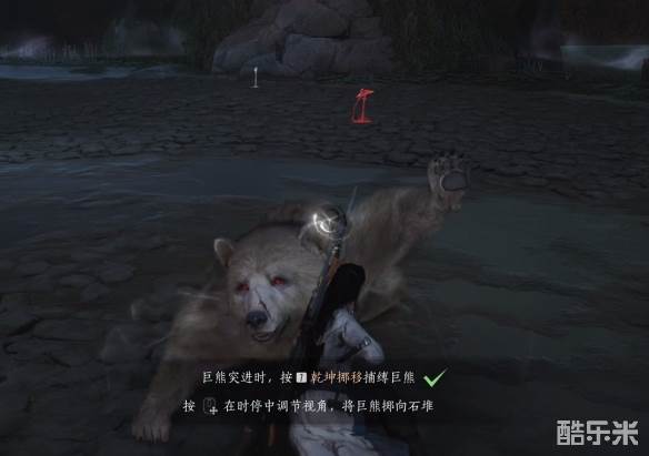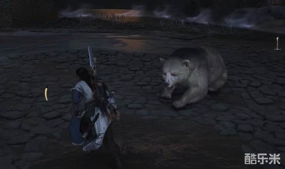 3、解开之后就可以下来打厚皮白化黑熊了,要采用乾坤挪移把熊摔到石头上才行。