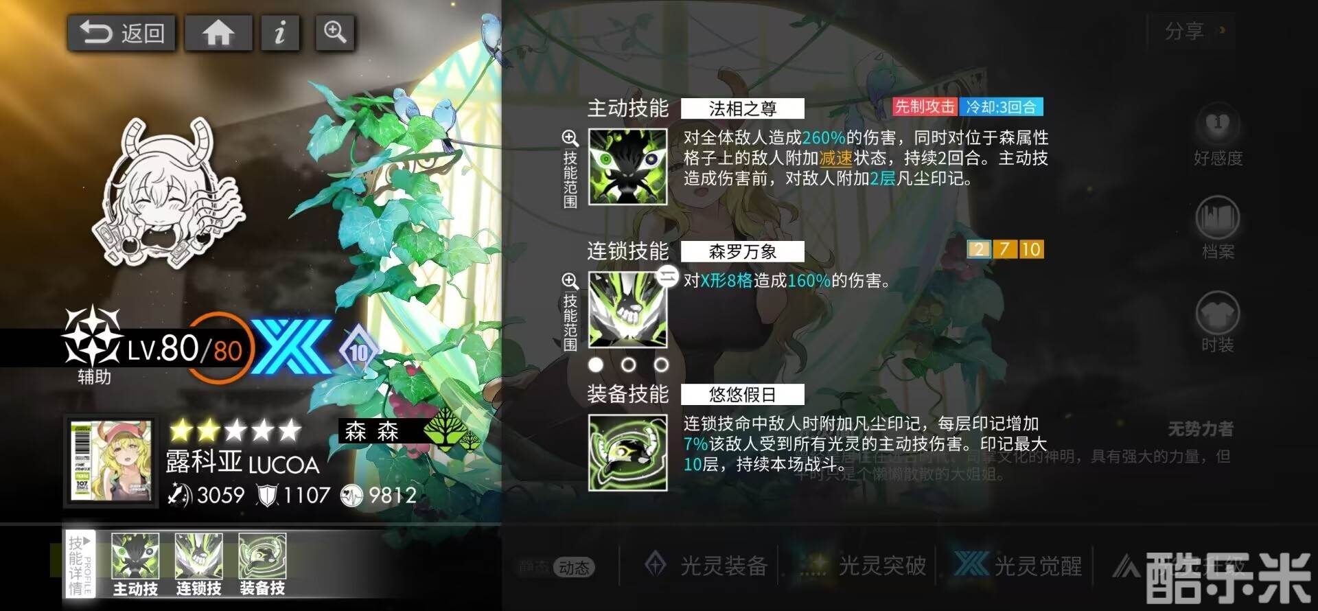 提升装备技能可以提升攻击防御生命值的同时,增益露科亚的森属性克制伤害,并且让每层印记的易伤提升到7%。