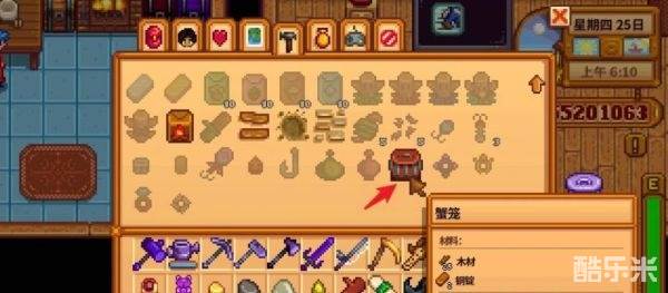 在蟹笼里面放置诱饵之前需要先消耗25个木材和2块铜锭制作需要的蟹笼。