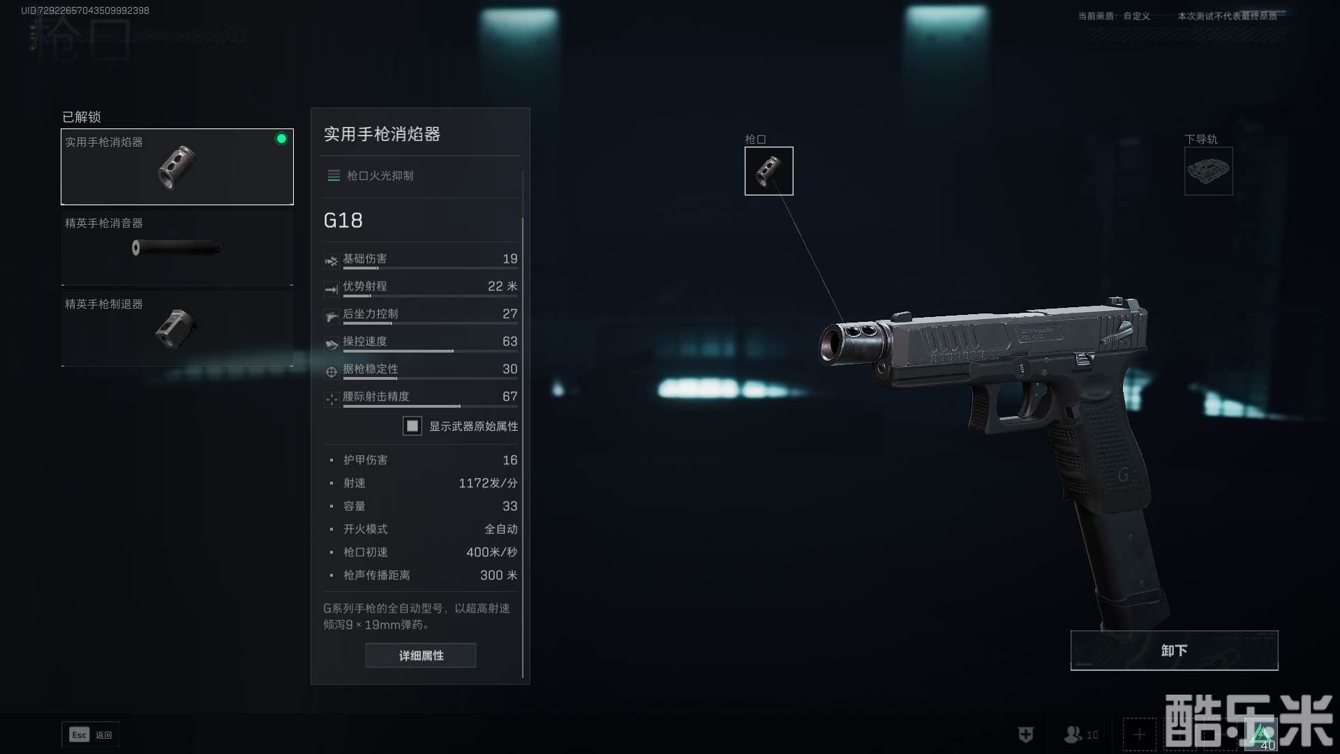 接着我们来说枪口,在这里我们有三个选择,消音器、消焰器、制退器。首先排除消音器,因为它除了消音本身以外都是负面效果。接着是制退器,它虽然增加的后坐力控制更多,但同时也降低了更多的操控速度,所以我跟人不推荐它,毕竟G18说到底还是一个近战武器。