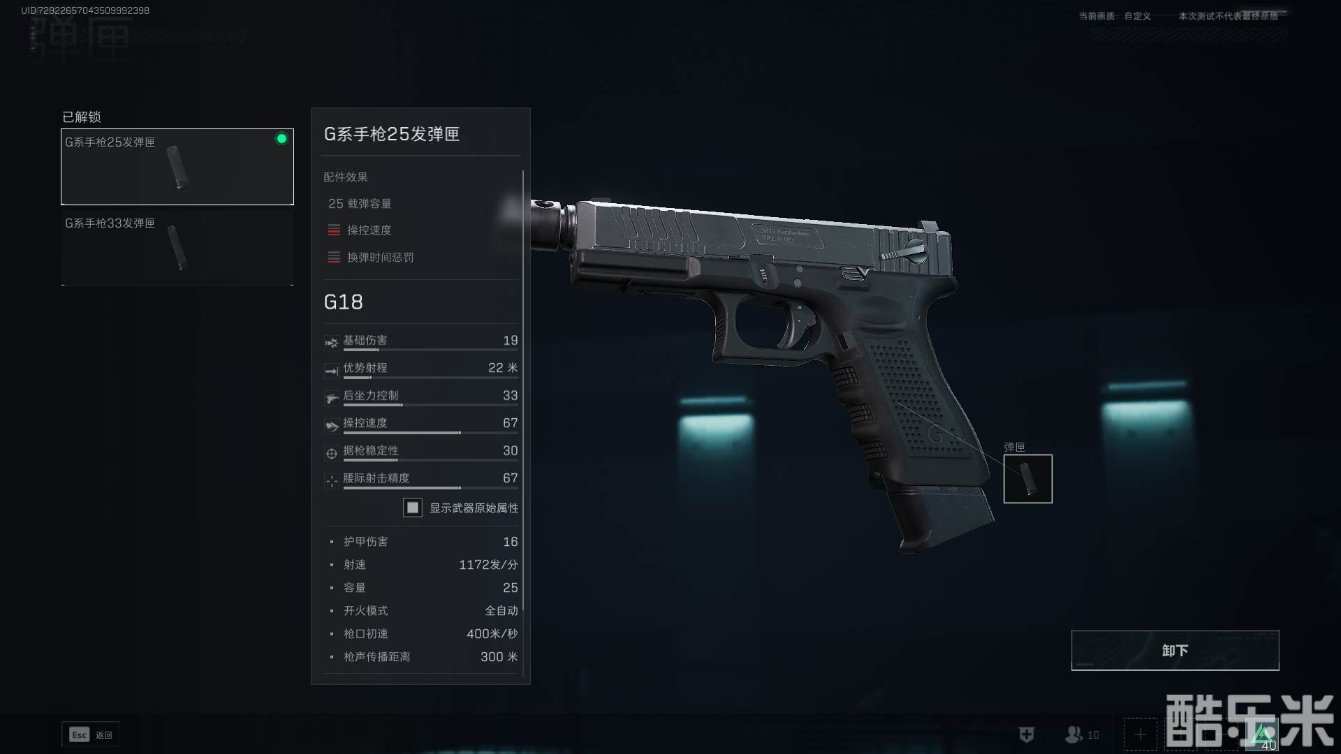 G18有两个弹匣分别是25发和33发的,他们之间的差异就是33发的负面效果更明显。这里其实选择什么都可以,看大家喜好就行了,我想提醒大家的是,G18默认的子弹肯定不够用,而且练级过程是很坐牢的,所以不如直接氪代币把G18直接升满级,手枪省满级所需要的代币并不多,因此是很划算的。