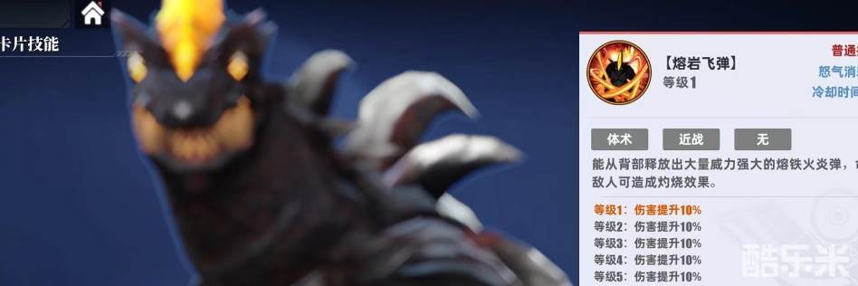 第2个技能是熔岩尾击,通过自身的尾巴进行两次快速甩动,攻击命中敌人造成火焰伤害,并点燃目标。自身还拥有一个觉醒技能熔铁射线,在身体的角和胸部发光,积蓄能量从口中射出赤红色的熔铁射线,将目标点燃。该怒气技能冷却时间30秒钟,有100点怒气消耗,通过提升觉醒等级获得更高的技能等级增加伤害。从这些技能都可以看出,能够造成点燃效果是该怪兽最大的特点。