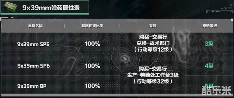 9x39mm SP5是3级弹,可在交易行购买,行动等级达到12级时也可以在战术部门进行兑换。9x39mm SP6和9x39mm BP分别是4级弹和5级弹,既可以在交易行购买,同时也可以通过生产来获取。