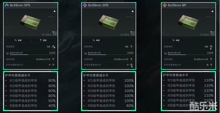 他们之间的主要区别在于对护甲的穿透效果不同,等级越高的弹药,护甲伤害衰减越小,对护甲的磨损能力越强。其中BP弹对护甲的伤害能力最高,面对1~6级护甲均能造成110%的甲伤。