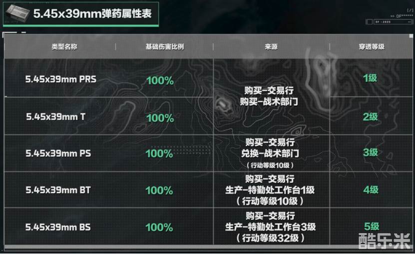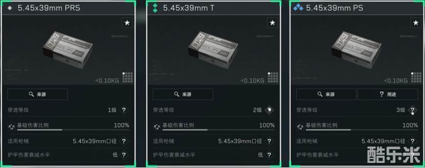 5.45x39mm弹药的基础伤害比例均为100%。但不同的是,越高等级的弹药其护甲穿透能力也越高。