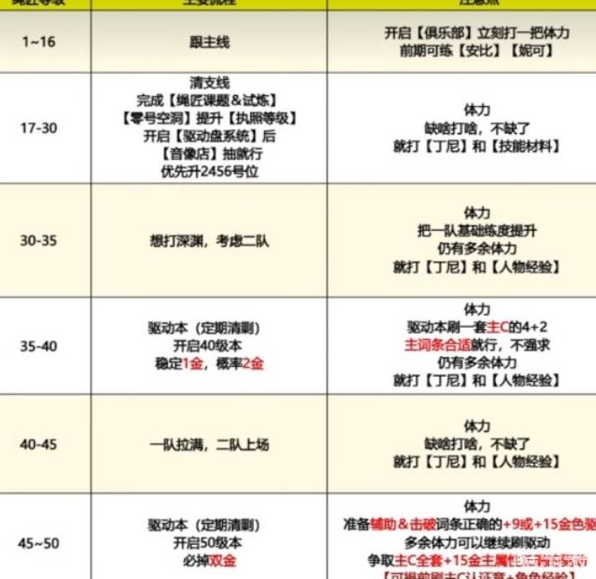 45~50:驱动盘开启50级本,必掉2金,可以着手给击破&支援位置刷各个位置的驱动盘,主词条和实即可并升级至+9或+12,整体实力获得较大提升,多于体力按照性价比或个人想法进行提升