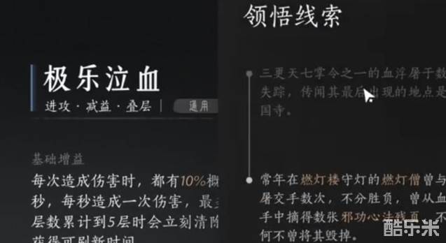 需要等级达到11级才能解锁“心法系统”,选择并激活对应的心法之后即可获得效果加成。在解锁心法系统之后我们打开心法的主要界面,选择对应的心法“极乐泣血”查看详情,我们可以看到这里有线索可以查看。线索告知玩家需要去到大相国寺的燃灯楼找到燃灯僧获取更进一步的线索。