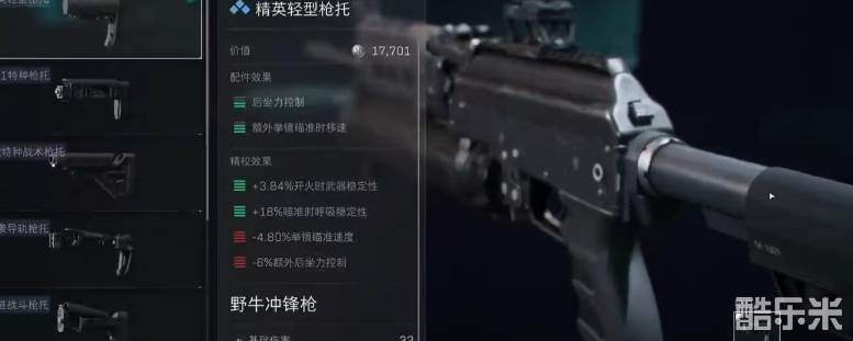 后握把方面选择稳定ak后握把,它能带来后座力控制效果的提升,精校之后还有瞄准时呼吸稳定性的提高。枪托选择精英轻型枪托,配件效果为后座力控制和额外举镜瞄准时移速的增加,精校时候可以提高开火时武器稳定性和瞄准时呼吸稳定性。在安装瞄具的时候,先添加上微型瞄具增高支架,用于抬高瞄准基线。然后再配上全景红点瞄准镜,这样中近距离战斗就非常精准了。因为冲锋枪不会用于远距离战斗,所以红点瞄准镜就已经足够。