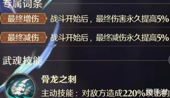 除了这个基础属性之外,它的特定技能也是很多玩家比较关注的,拥有一个主动技能为骨龙之刺,可以对敌方造成220%的攻击伤害,还会带来额外20%的自身生命上限的真实伤害,并且使自身暴击提升25%,持续时间为2回合,只能在武魂真身状态下使用。而这个造成的伤害数值也会随着技能品阶的提升而不断增加,如果玩家们能将其提升到满星,那么最多也能达到400%的伤害,完全可以秒杀对手