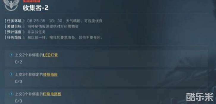 而且,现在也引入了单排,任务做起来还是比较简单的。需要注意的是,提前预留一些非绑定的任务用品,不然到时会卡任务道具就比较尴尬了。特别像是聚乙烯、防弹陶瓷、特种钢这种,可以多去航天基地刷一刷。任务描述中是“上交”的,也可以直接购买。