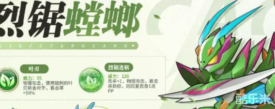 首烈锯螳螂的技能是物理攻击,会使用锐利的叶刃斩击对手,并提升自身50%的暴击率,它的绝招是物理攻击,如果成功击杀敌人的话,会回复自身一点的pp值,需要注意的就是绝招,我们需要多带几只进行切换避免给它形成回复效果。