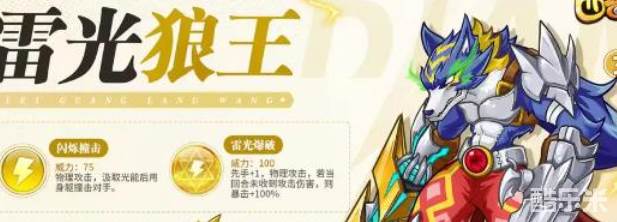 雷光狼王是雷系,由雷小狼进化而来的,原来是个体型非常小的狼,奔跑起来很快,在电系精灵中是非常强大的存在,它的第一个技能可以用高电量的电刃攻击对手,如果自身存在聚气的话,攻击时能加100%暴击率,它的二技能会斩击对手并且吸取它的能量,使用后能获得一层聚气效果,它的绝招可以让自己先手对敌方攻击,如果这个回合没有受到任何攻击伤害,就能加100%暴击率。