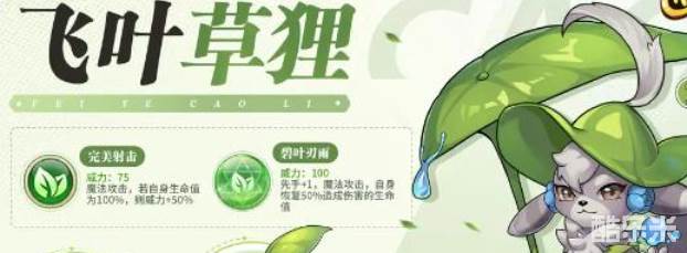飞叶草狸是草系,这是一只非常喜欢晒太阳的小狸猫,它有一片大叶子,不管走到哪都会携带,传闻中这是片神通广大的叶子,能让飞叶草狸变身成任何物品,它的技能完美射击时魔法攻击,如果使用的时候自身生命值是100%的话,威力还能提升50%,它的绝招也是魔法攻击,能恢复自身50%造成伤害的生命值。
