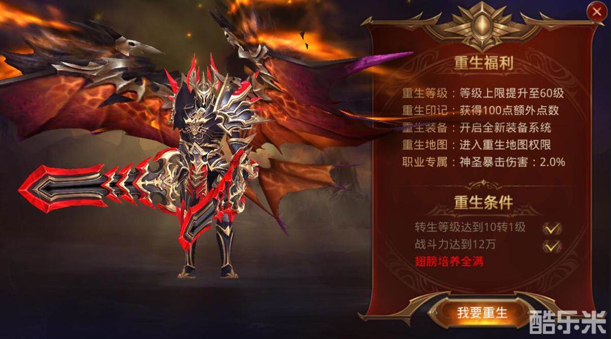 当玩家首次进行重生的时候,需要达到10转1级,战斗力12W,翅膀的培养全满。这里的翅膀培养包括了,注灵,注魂,以及翎羽的升级,不过相信在奇迹大陆上奋战许久的一批勇士们早就已经满足了这第一层的条件,新版本开启就可以直接进行重生,伴随着第一次重生,勇士会被赋予,重生印记的点数,重生地图的进入权限,重生装备的开启,以及不同职业所对应不同的职业专属属性。