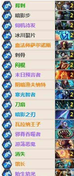 我们起手留背刺、刺骨、闷棍,对上快攻卡组我们可以留冰川裂片、末日预言者以及刀扇;对上控场卡组时可以留暗影步、寒光智者。要注意的是对上自闭卡组时尽量避免给对手牌,过两张爆掉对手一张牌也是亏的。对上快攻卡组时不要吝惜消失,毕竟现在的快攻抢伤害的能力都很强,不稳一点很容易被偷鸡。
