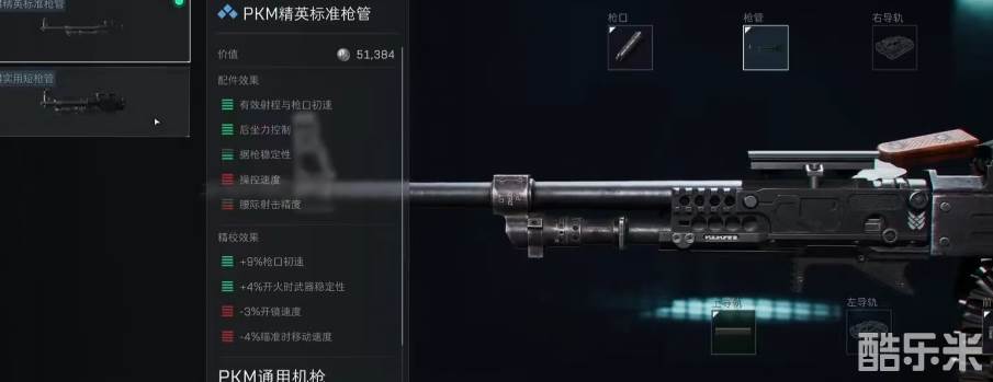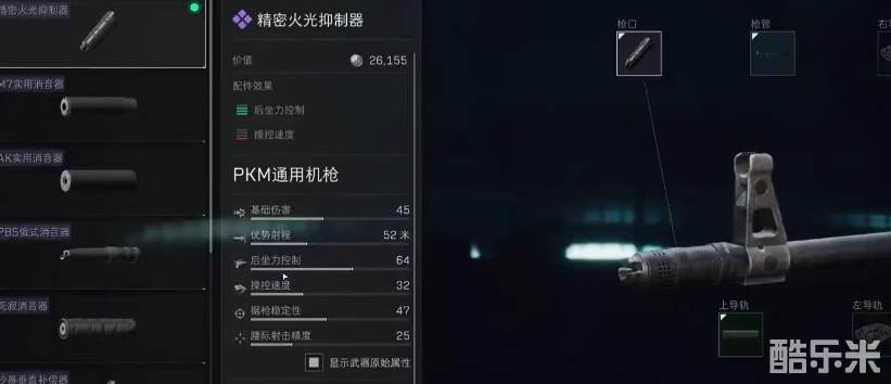 对于pkm来说,射程和初速以及稳定性都非常关键,改装时也要注意增加这些属性。在枪管方面推荐大家选择pkm精英标准枪管,它对有效射程、枪口初速、后坐力控制、据枪稳定性等属性方面都有很好的提升,比pkm实用短枪管要更适合大家选择。枪口方面选择搭配一个精密火光抑制器,它能够提升后坐力控制。