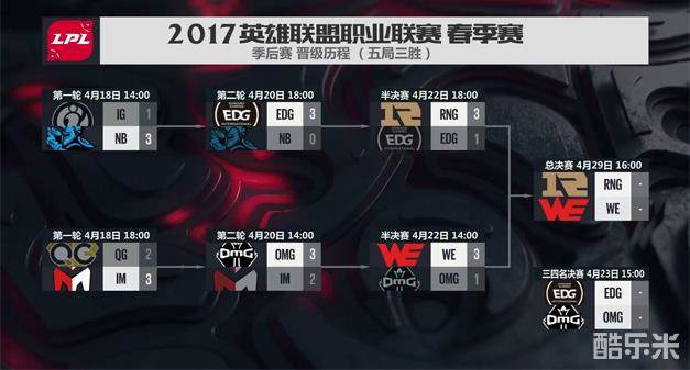 4月22日,2017赛季《英雄联盟》职业联赛(LPL)春季赛季后赛四强战在上海正大广场进行。在当日的比赛中,RNG、OMG、WE、EDG四支国内顶尖战队展开捉对厮杀,在经过两场精彩激烈的高水平对抗后,RNG、WE分别淘汰各自对手,晋级总决赛。春季赛总决赛将于4月29日在南京奥体中心体育馆举行。