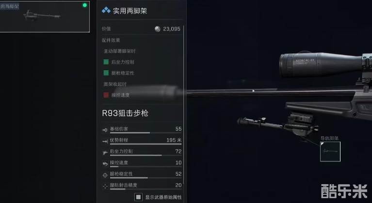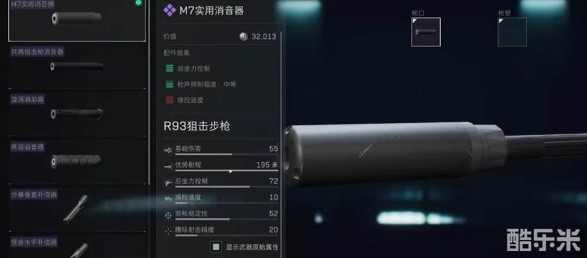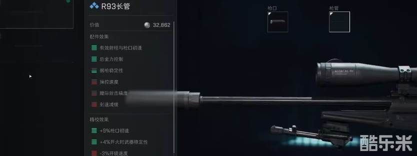 作为狙击枪,为了射程方面的优势,枪管自然是必须要选择的配件。推荐大家选择R93长枪管,它可以有效提高射程与枪口出处,还有后坐力控制,据枪稳定性等优势,让射击的时候变得更加稳定。精校之后可以提升枪口初速,以及开火时的武器稳定性,价值只需要3万左右就可以入手。