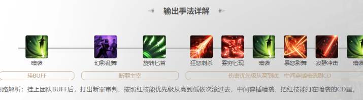 简单来说就是在循环中优先打输出占比高的技能,然后全程补好“断罪”以及“主宰”,再不断穿插可以减少cd的“暗袭”即可。